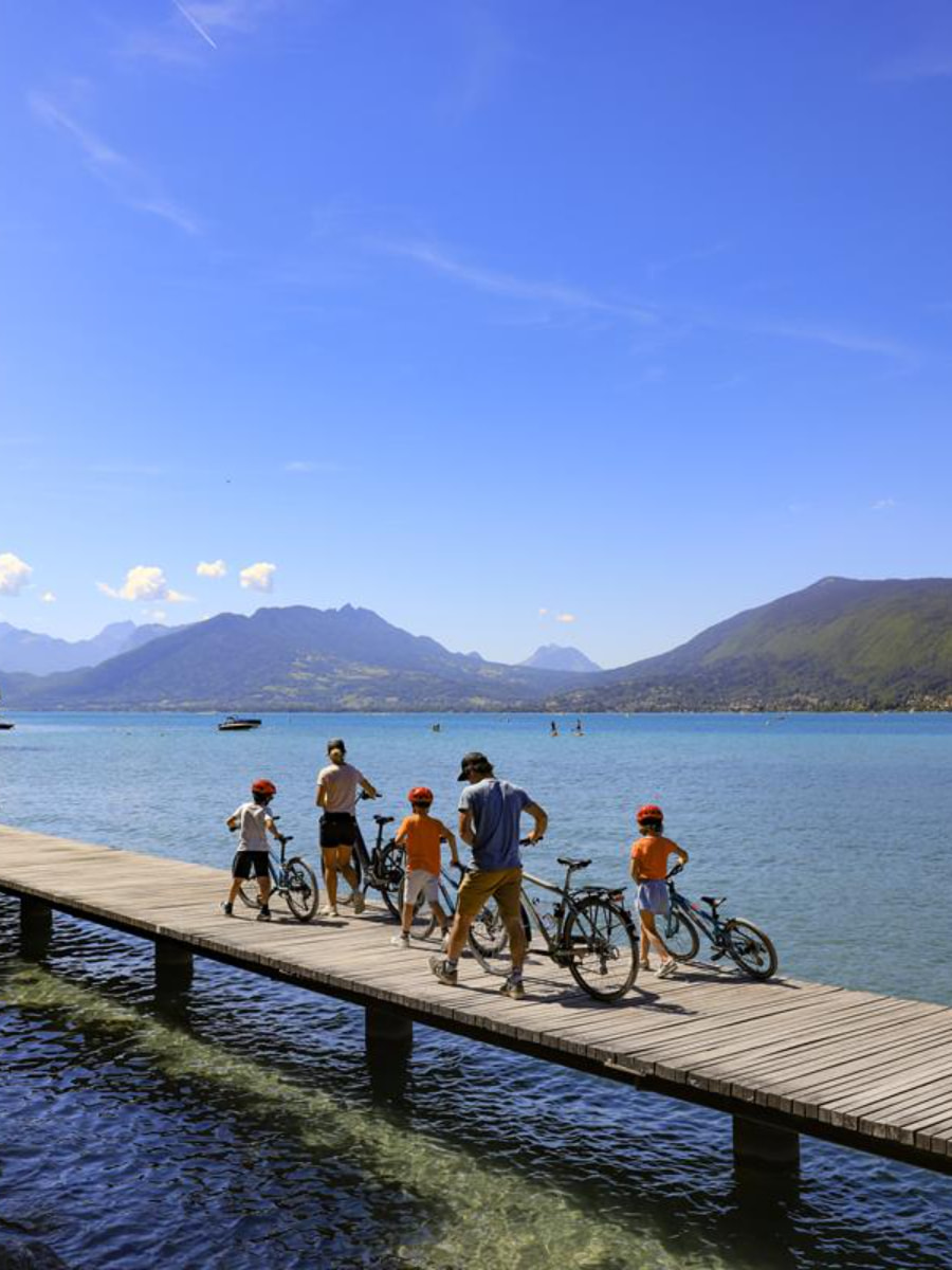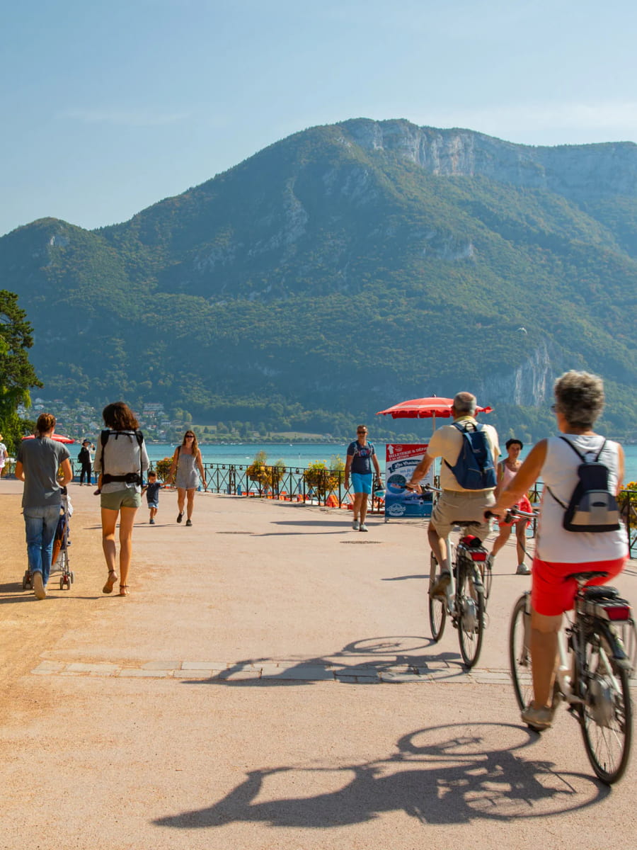 Ventajas del ciclismo. La ruta ciclista de 42 kilómetros que rodea el lago comienza justo a las puertas de la mayoría de las propiedades frente al mar. Alquilé bicicletas en las estaciones automáticas por 2 € la hora, y la ruta llana junto al lago te lleva a Talloires en 45 minutos sin subidas empinadas que cansen a los ciclistas ocasionales.