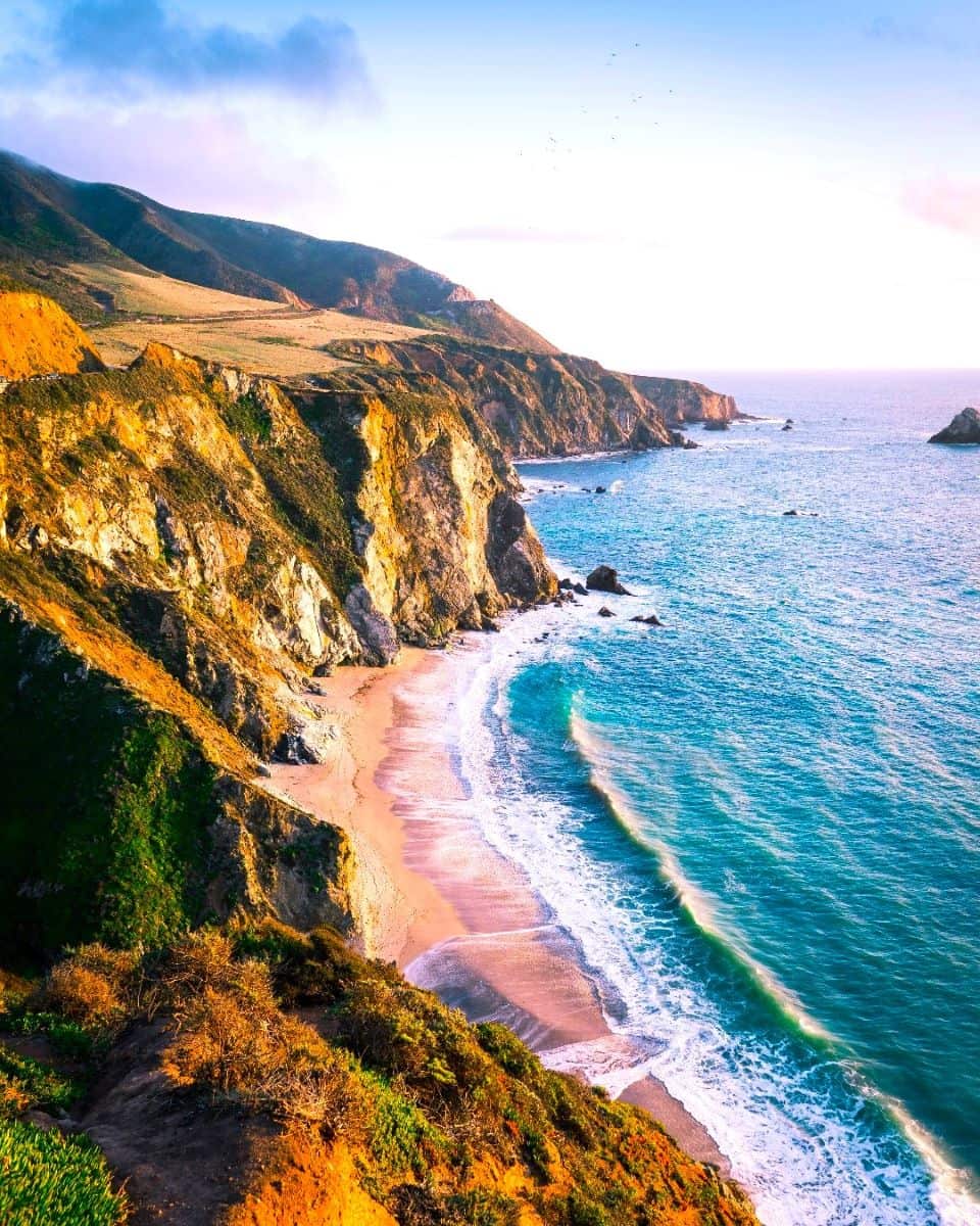 Paraíso playero. Carmel Beach se encuentra entre las playas más bonitas de California. La arena blanca contrasta maravillosamente con el agua turquesa, y es una de las pocas playas donde los perros pueden correr sin correa. La forma de media luna de la playa crea una cala protegida perfecta para nadar y pasear por la orilla.