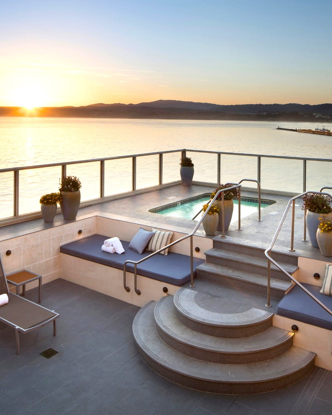 El spa de la azotea del Monterey Plaza Hotel ofrece unas vistas incomparables de la bahía de Monterey, además de tratamientos de lujo y relajación. La experiencia del Vista Blue Spa combina servicios de bienestar con impresionantes vistas al océano que muestran lo mejor de Monterey.