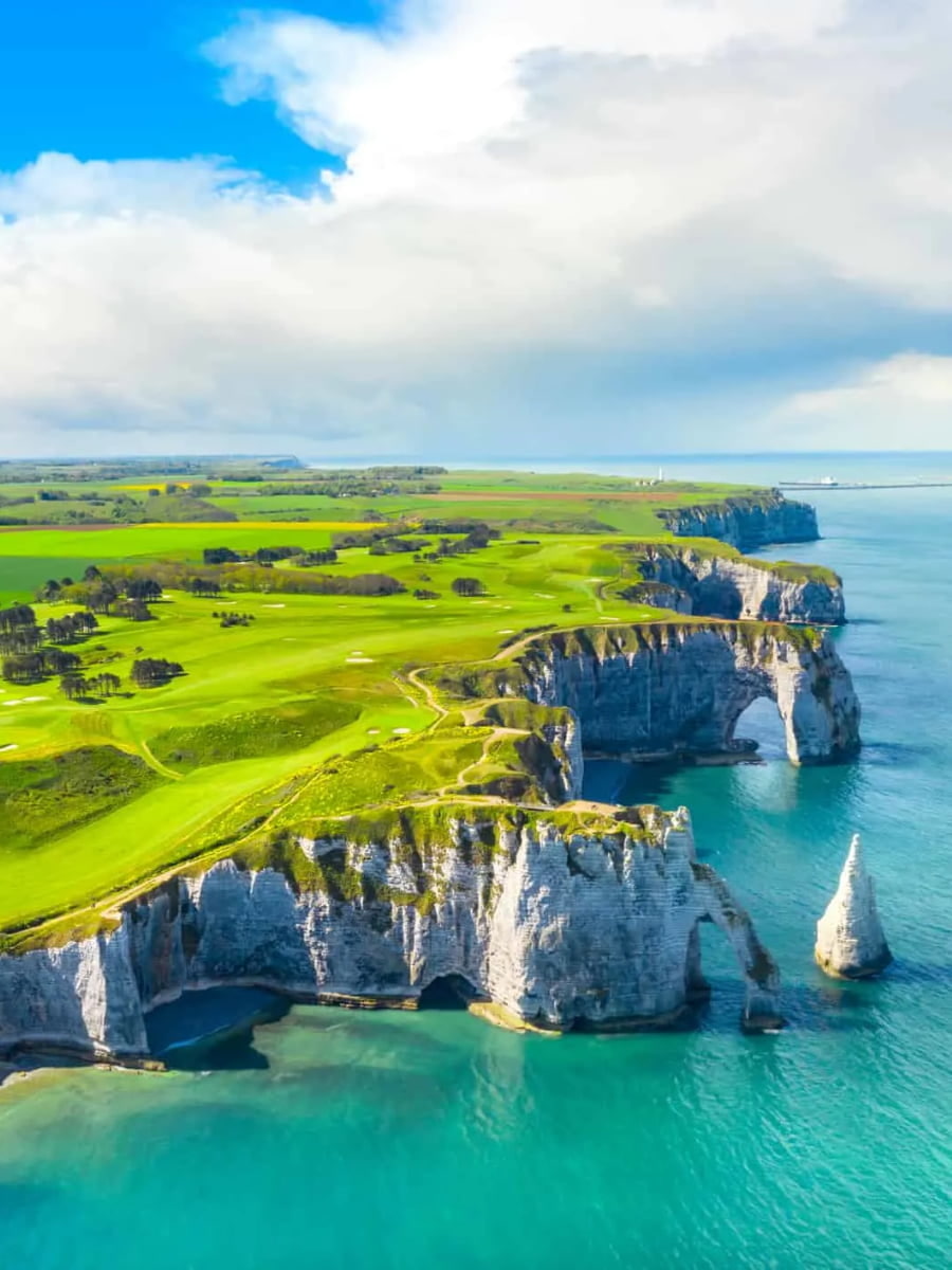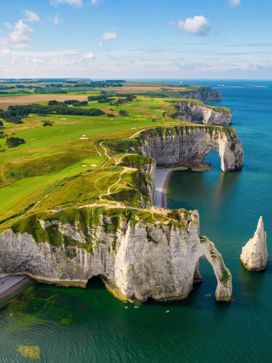 Famosos acantilados blancos. Los espectaculares acantilados de creta y los arcos naturales crean uno de los paisajes costeros más espectaculares de Francia. La Falaise d’Amont y la Falaise d’Aval ofrecen diferentes perspectivas, con rutas de senderismo que conducen a miradores que inspiraron a pintores como Monet y Courbet.